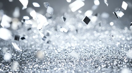 Abstract background with falling shiny silver confetti creating a festive and celebratory atmosphere.
