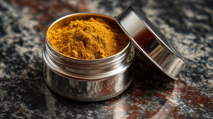 Vibrant yellow spice powder, likely turmeric or curry, in a polished silver container with lid on a dark granite countertop. Aromatic ingredient for cooking and wellness.