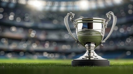 Shining silver trophy catching gold confetti on light wooden tabletop celebrating victory
