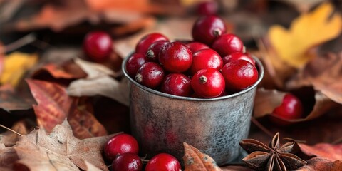 Rustic silver cup filled with bright red cranberries placed on a bed of vibrant autumn leaves featuring warm oranges and yellows with star anise accents