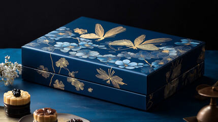 Luxury perfume box mockup with deep navy blue box and silver embossed logo, placed on a reflective glass surface, soft ambient lighting, premium and sophisticated presentation