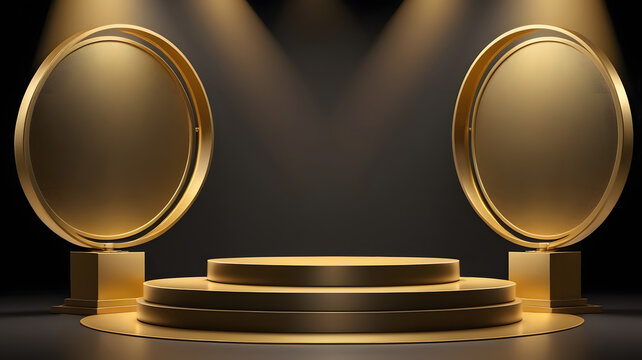 Gold background podium stage golden 3D platform light stand product. Background podium abstract gold award scene pedestal luxury studio black display show premium template ceremony elegant winner.