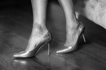 Sparkling Silver High Heeled Shoes Resting on Marble Flooring
