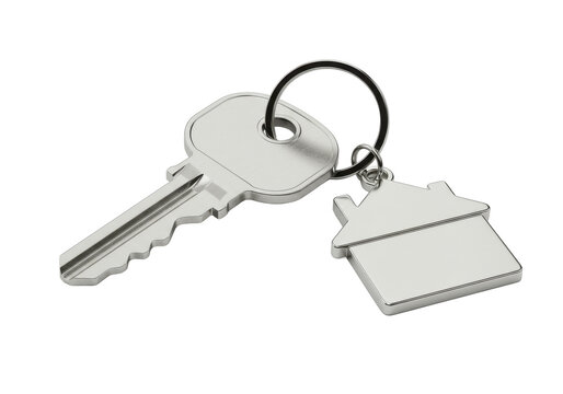 Silver house key with home-shaped keychain on white background