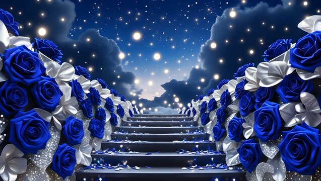 "The Moonlit Garden Staircase: Blue Rose Blossoms and Shimmering Silver Petals Rising to Meet the Galaxy Above" – Jaise chand ki roshni mein snata hua ek bagh, jahan neeli gulabon aur silver ke paton