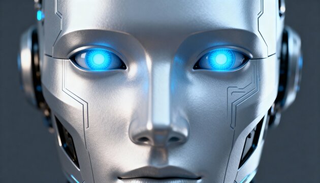 Futuristic silver robot face with glowing blue eyes and intricate mechanical detail, a close-up portrait on a muted background.