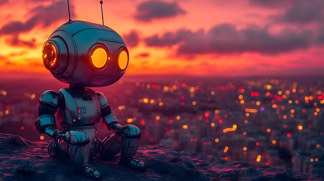 A cute, retro-style silver robot with wheels and expressive eyes, standing against a white background, symbolizing technology and futuristic play