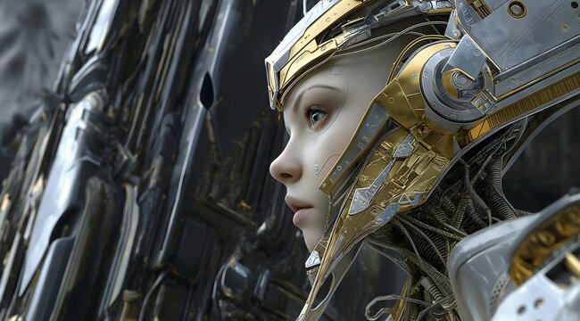 golden and silver robot woman with an elongated neck is thinking, surrounded by dark gray metallic structures in the background