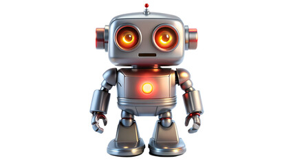 A robot with a silver face and yellow eyes. The robot is standing in front of a white background