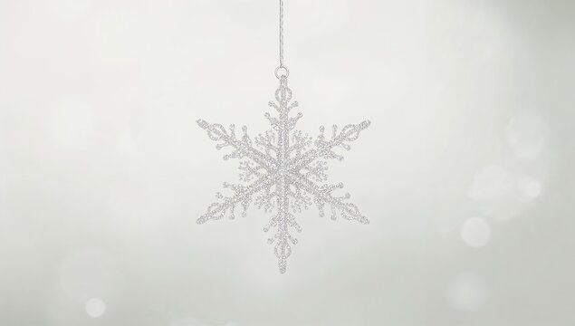 Sparkling holiday scene features a glittering silver snowflake ornament suspended against a blurry emerald backdrop of shimmering light