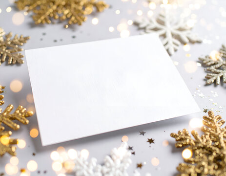 Elegant Christmas invitation mockup featuring a blank white card surrounded by festive gold and silver snowflake decorations and shimmering bokeh lights