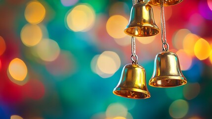 A string of golden bells hanging from a silver thread isolated on a colorful background