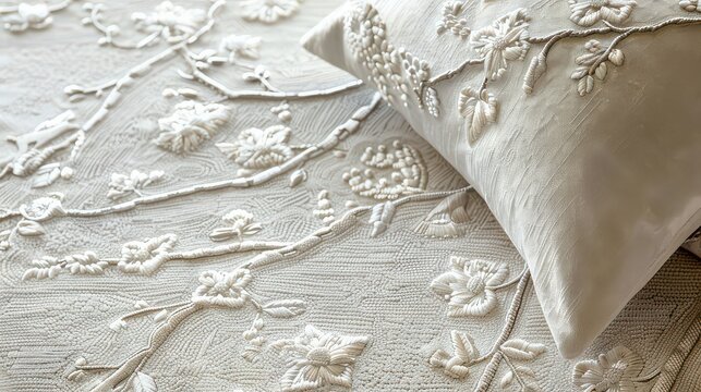 A glamorous rug with delicate, hand-embroidered floral designs in silver thread against a plush ivory background
