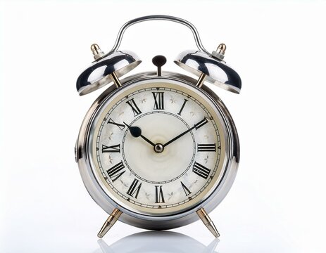 Retro silver alarm clock. 9:00, am, pm. Blue background.