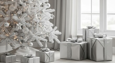Elegant Christmas Scene - Silver Tree and Wrapped Gifts.