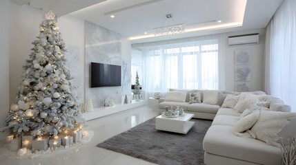Luxury minimalist living room decorated for Christmas with white and silver tree, elegant wrapped gifts, soft lighting, and cozy details creating a refined winter holiday atmosphere