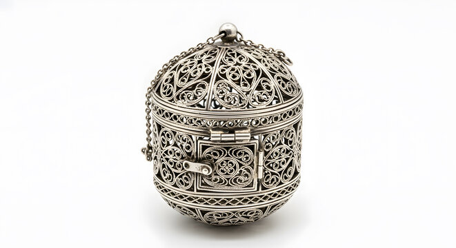 A delicate silver filigree ball ornament with intricate swirling patterns hangs suspended against a rich dark background