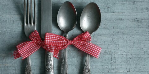 Silverware bundle of fork, knife, and spoons, tied with red and white checkered ribbon on wood