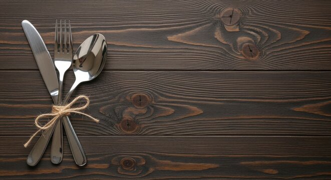 Rustic Elegance: Silverware Set Tied with Twine on Dark Wood Table