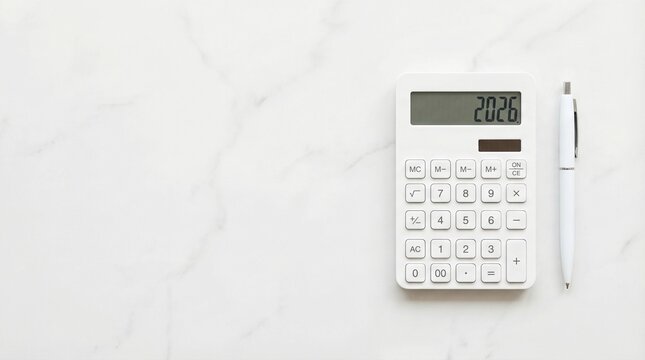 White calculator showing 2026 on clean surface with pen beside it. Minimalist financial planning tool for future budgeting and annual goals. Color of the year 2026 concept in simple design for office
