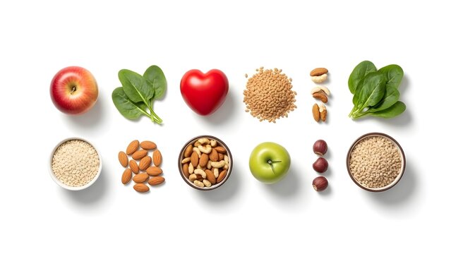 A vibrant arrangement of healthy foods including fruits, nuts, and grains on a white background