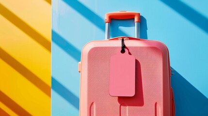 A simple, brightly colored luggage tag attached to a minimalist suitcase