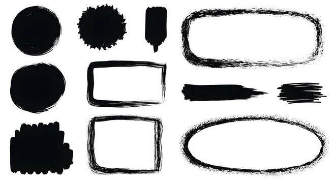 Black graphic shapes including circles, rectangles, and scribbles against a white background