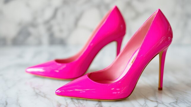 Bright pink high heels placed on a marble surface create a striking display of style and elegance in a simple yet bold arrangement