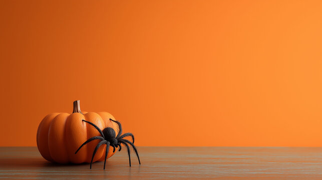 Halloween Pumpkin and Spider:  A small, ornamental pumpkin sits beside a large, realistic spider against a vibrant orange backdrop, capturing the spooky essence of Halloween.