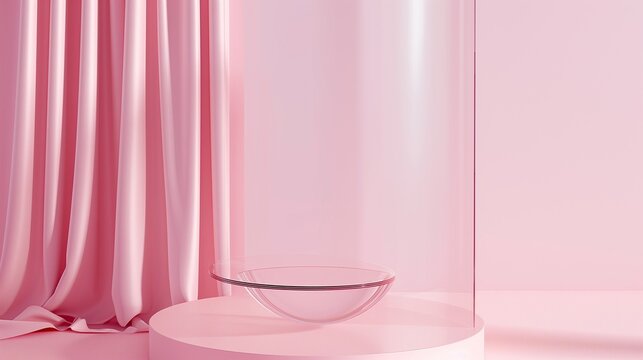 3D rendering of pink pastel podium with glass cylinder showcase.
