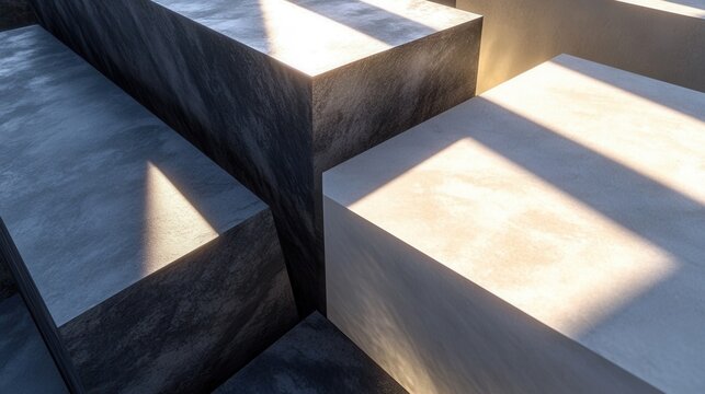 Layered geometric squares create a modern design with overlapping light and shadow effects in an outdoor space during the day