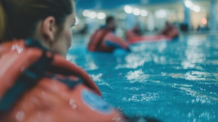 Medium shot of workplace staff engaged in simulated water rescue drills at an indoor pool focusing on the rescue board while peers remain softly blurred
