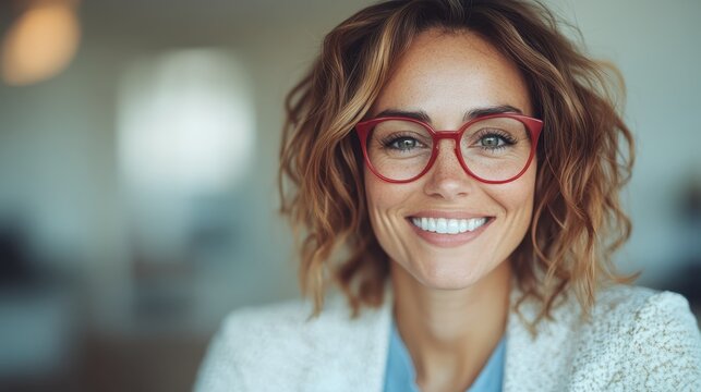A friendly woman with distinct red glasses smiles warmly at the camera, exuding confidence and a positive vibe in a modern and stylish environment.