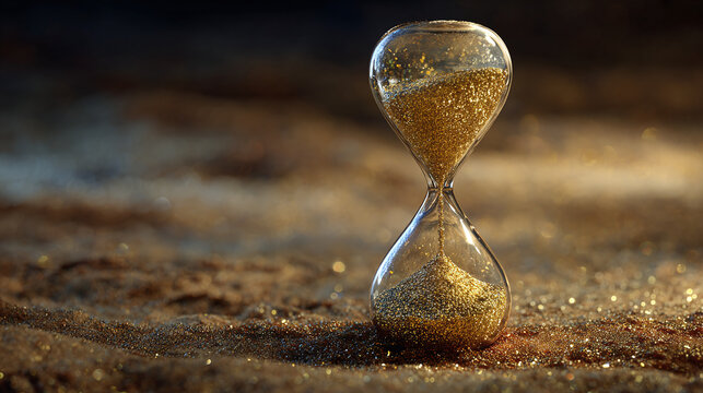 An hourglass with gold sand, symbolizing the passage of time. The fine sand grains are slowly falling, evoking a sense of urgency and reflection