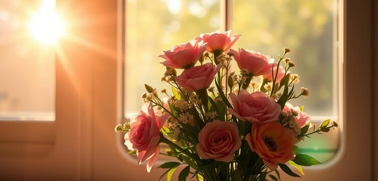 Warm sunlight filtering through a window onto a simple, elegant bouquet of flowers, expressing sincere thanks and appreciation,  nature,  sunlight