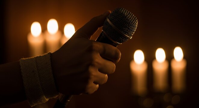 Hand Holding Microphone  Candlelight Background  Close Up