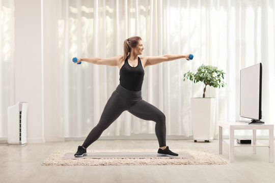 Fit Caucasian women doing crane exercise standing on one leg with their arms out to sides holding on to balance ball while training in fitness club