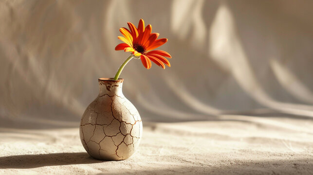 A close-up of a single flower standing alone in a cracked vase, with shadows creating a stark contrast in the background.
