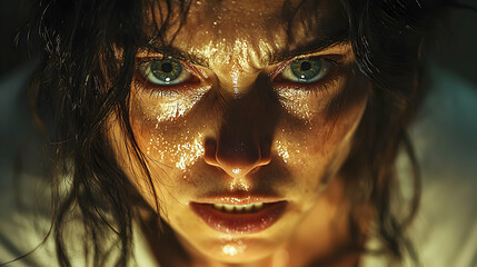 Moody low-key closeup showing intense female gaze and skin texture in narrow light