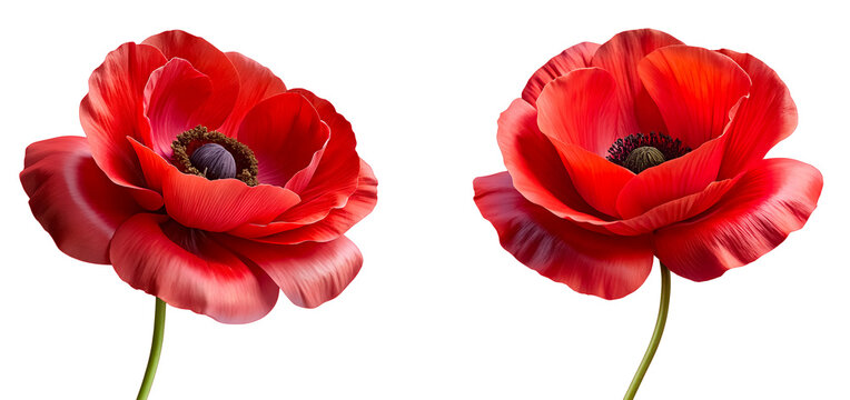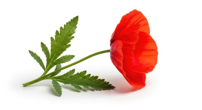 A single red poppy flower with green leaves on a white background.