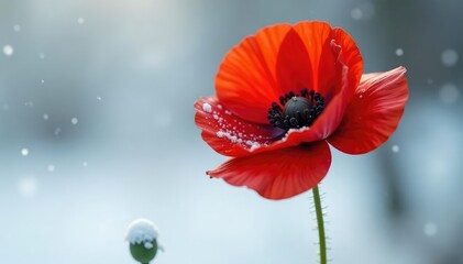 Dark red poppy isolated against a snowy backdrop, blossomed, bloom, single
