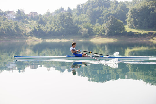 Performing single-arm stability pushup on medicine ball in gym studio for core strength