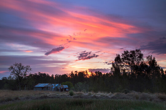 Beautiful sunset over Teds Hut and dam .Sedgefield near Singleton. Hunter Valley of  N.S.W. Australia.