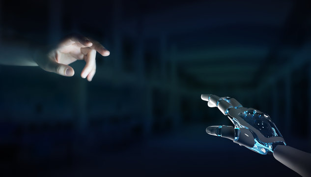 Hand of businessman touching hand artificial intelligence meaning technology connection go to future