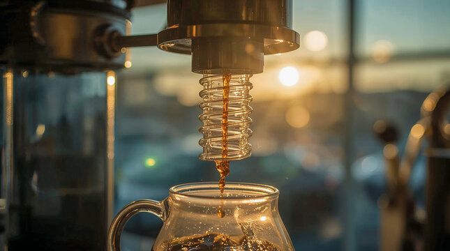 A close-up of a coffee siphon brewing, with rich brown coffee dripping into a glass carafe against a backdrop of warm sunset bokeh.