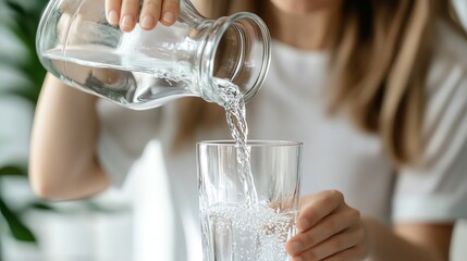 Woman pouring refreshing water into a clear glass.