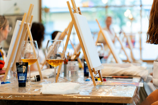 Art & Wine workshop. People enjoying paint and sip art workshop