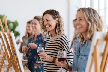 A group of women laugh and paint on canvases while sipping wine inside a cozy, sunlit studio filled with easels and vibrant colors