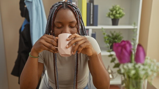 African american woman with braids sipping from a cup indoors, exuding a relaxed home atmosphere.