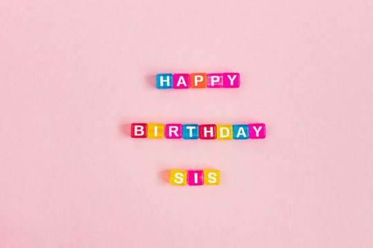 Happy birthday sis inscription made of colorful cube beads with letters. Festive pink background concept with copy space
